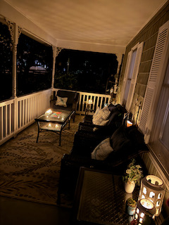 I love my front porch during the day and I wanted to make it just as cozy in the evening. I used fairy lights, cute throw pillows, and potted plants to create an inviting and cozy space.